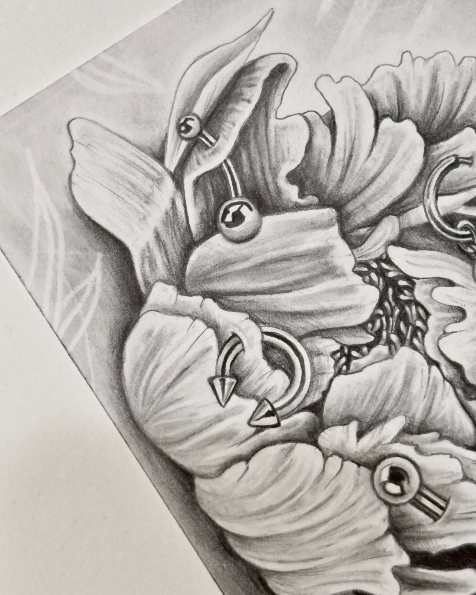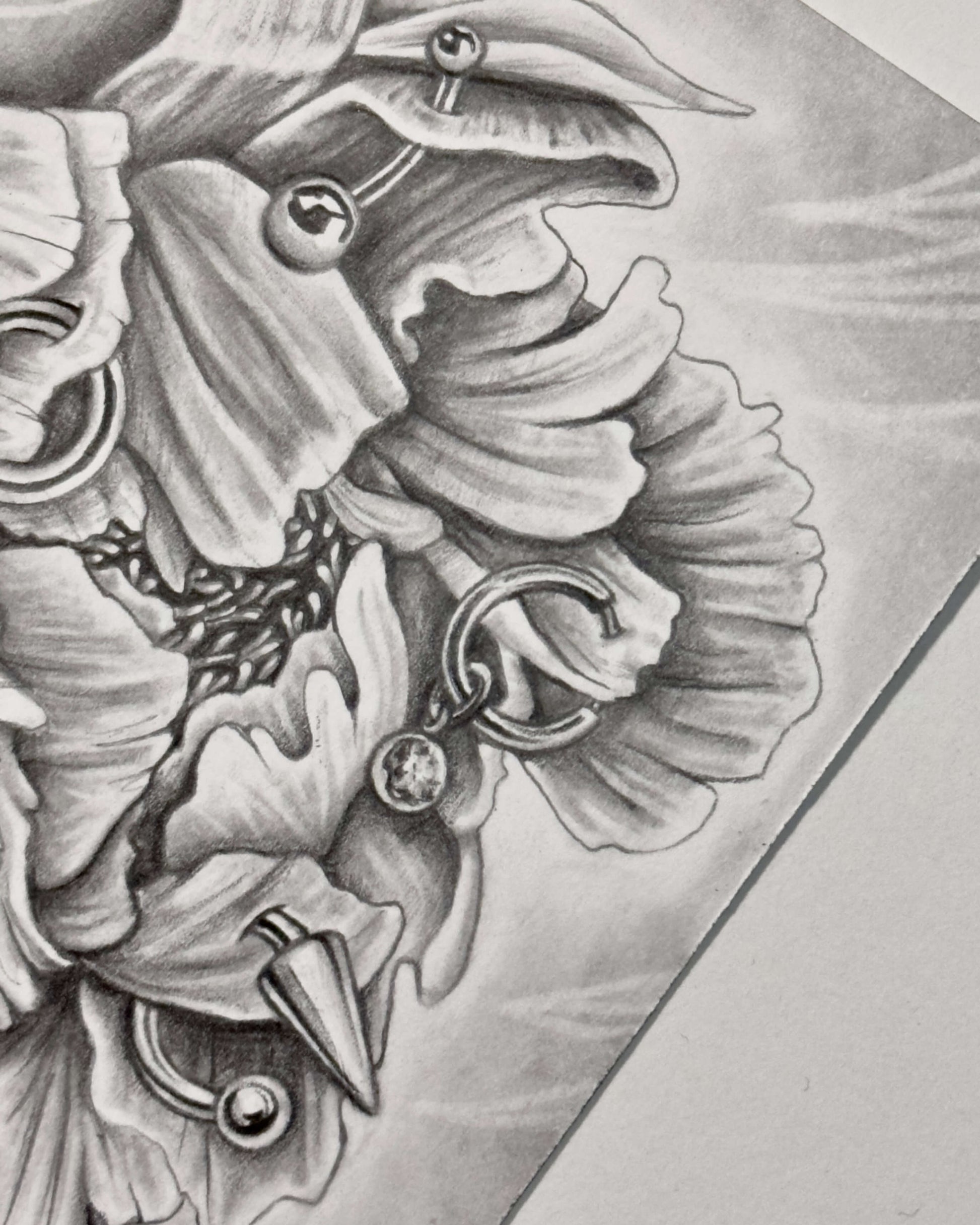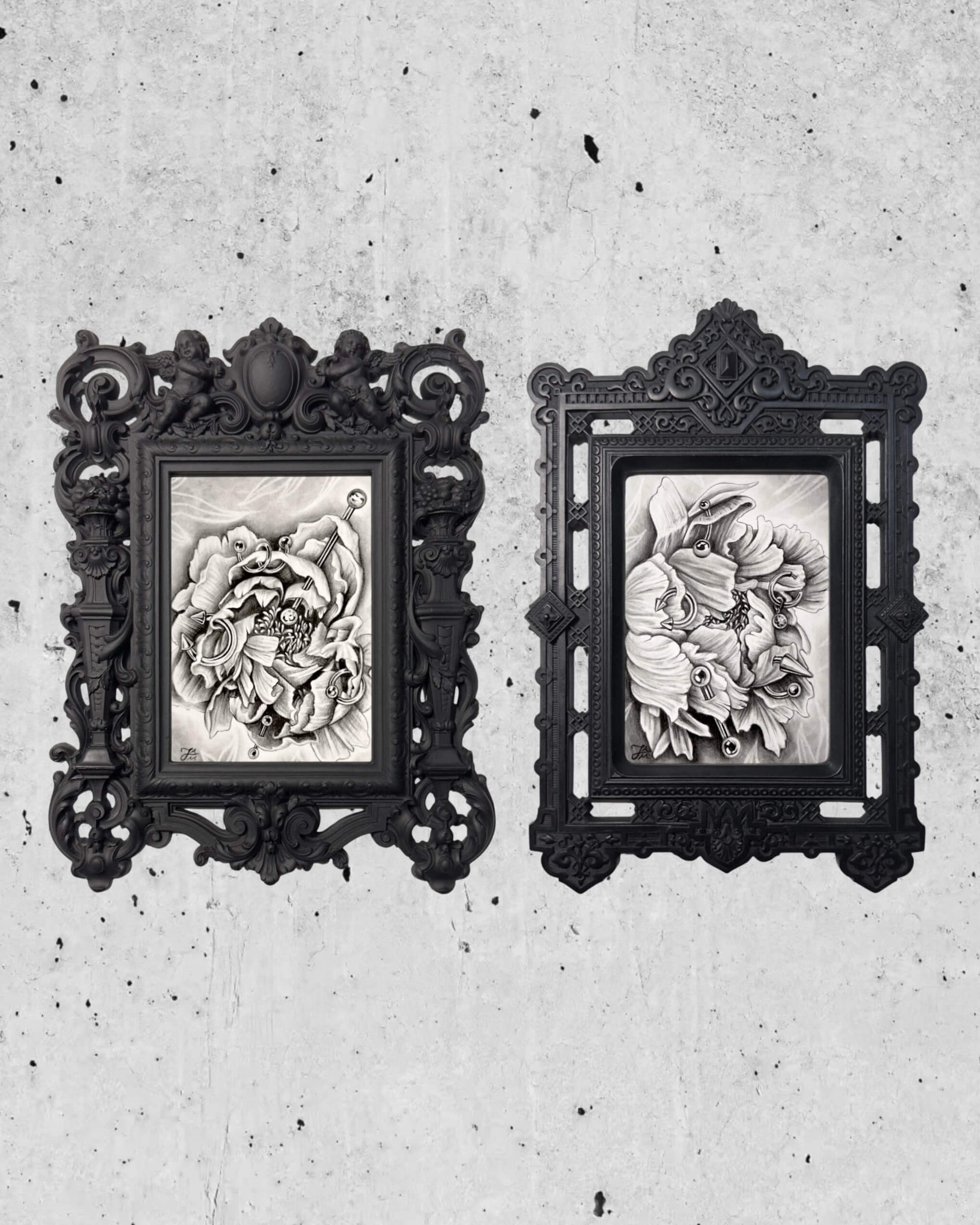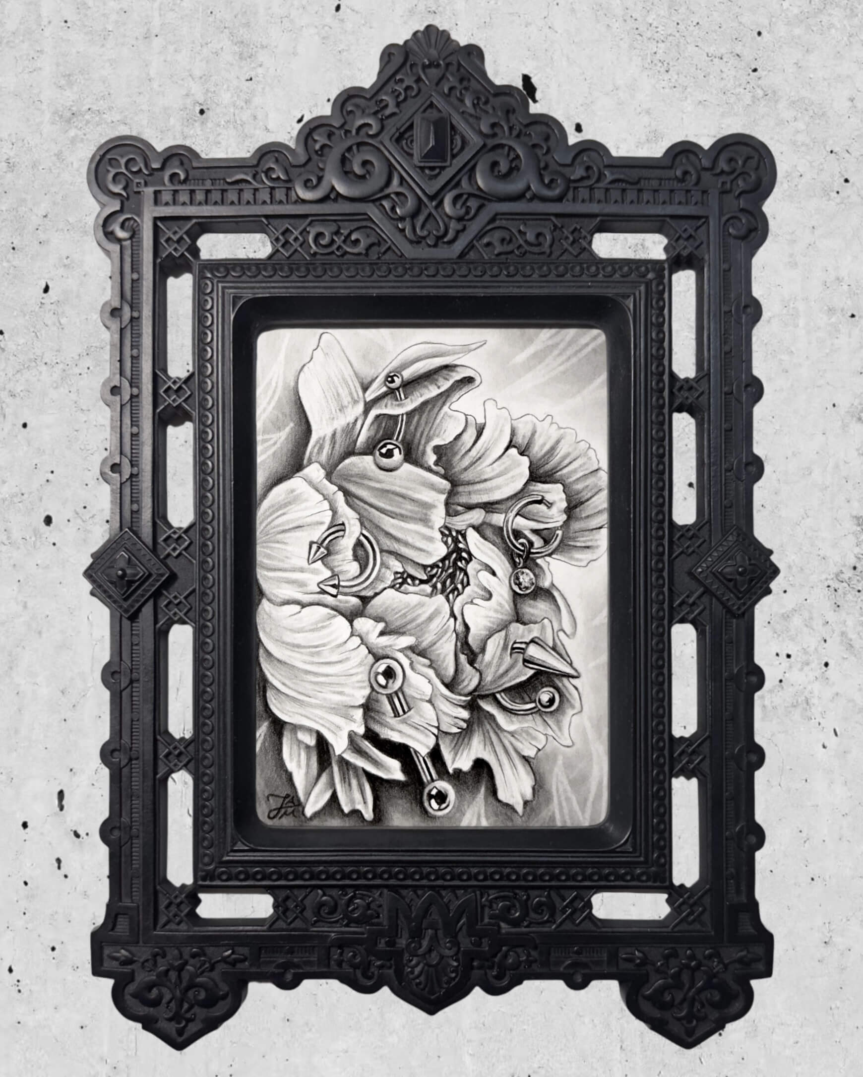 5.5x4 inch graphite drawing on 270gsm smooth Bristol fine art paper. Comes behind acrylic plexiglass with the black resin geometric victorian gothic frame. Part II of a pair of drawings sold separately. 7x11 inches overall with frame.