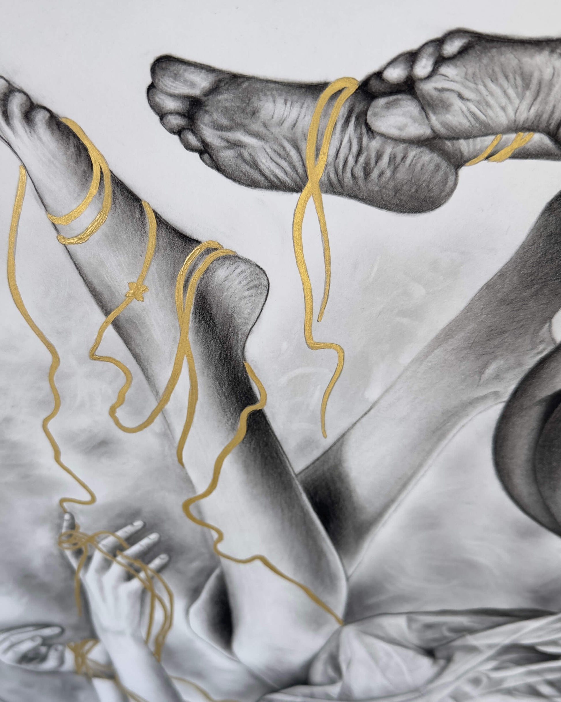 14x24 inch charcoal pencil drawing, with gold leaf paint detailing, on 270gsm smooth Bristol fine art paper. Includes fixative coating to preserve the drawing and prevent smudging. Comes with the black frame.