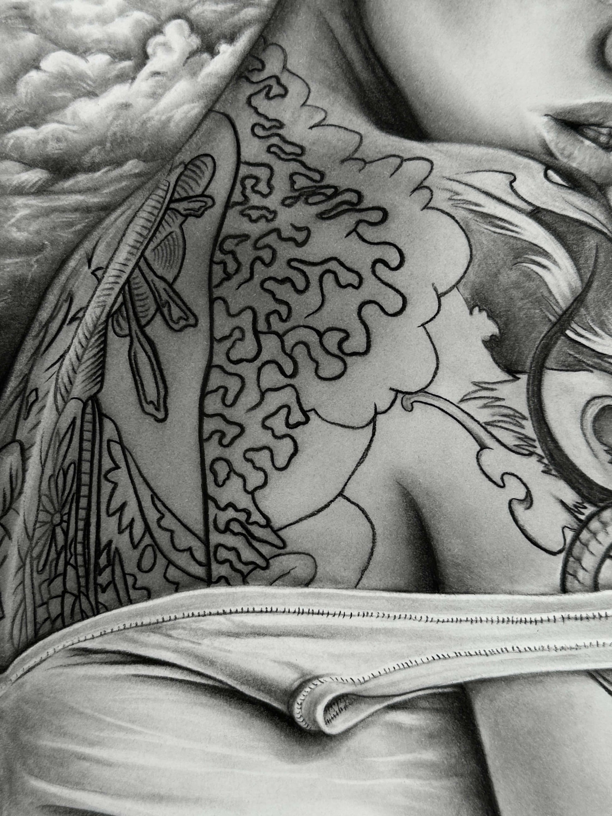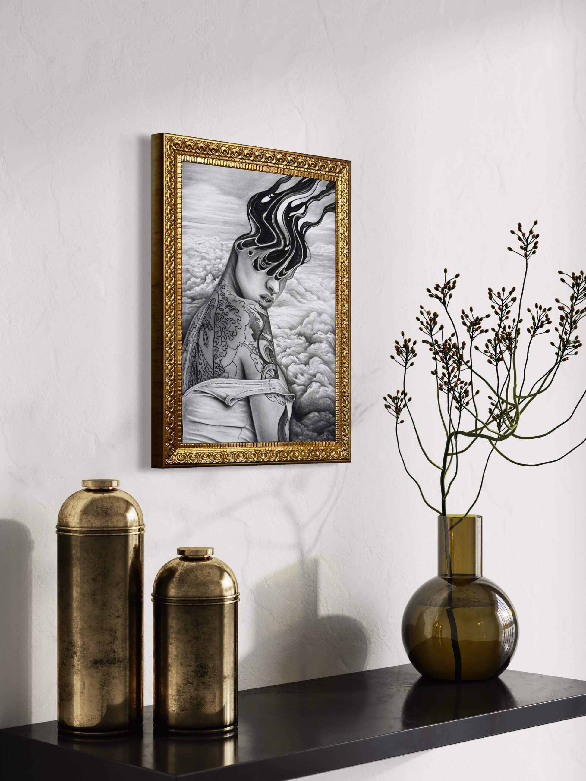 11x14 inch charcoal drawing on 270gsm smooth Bristol fine art paper. Includes fixative coating to preserve the drawing and prevent smudging. Comes protected behind glass, in a distressed metallic gold leaf frame, measuring 13x16 overall.