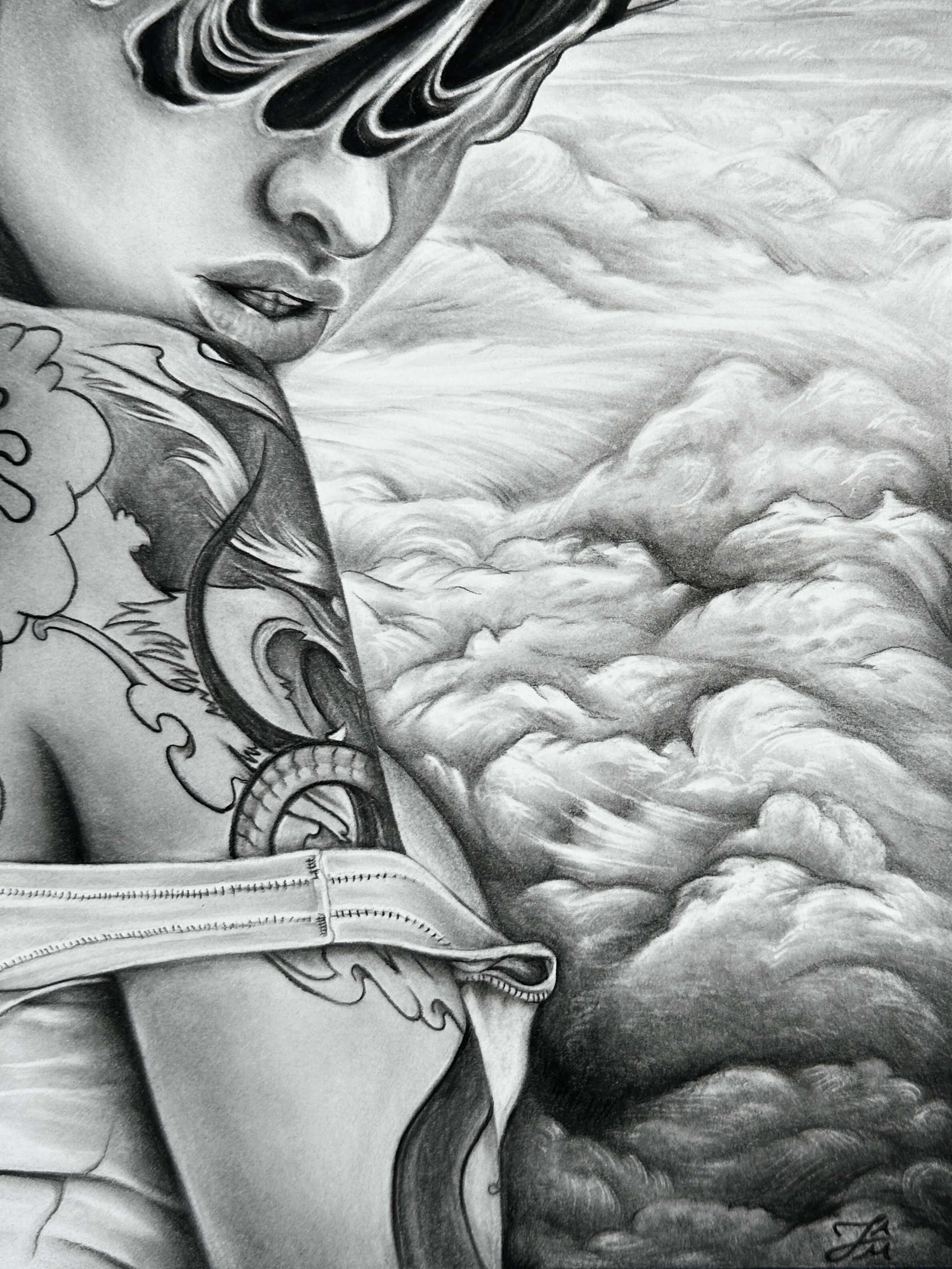 The head is disintegrating, dissolving, melting into the sky. It's the release of the thoughts, judgements, and opinions that others have seeped into one's brain. Choosing to be your authentic self despite what some think. Letting go of overthinking, and trusting oneself to figure it out along the way. We cannot see the destination, all we can do is enjoy the journey, wherever it may lead through the clouds.