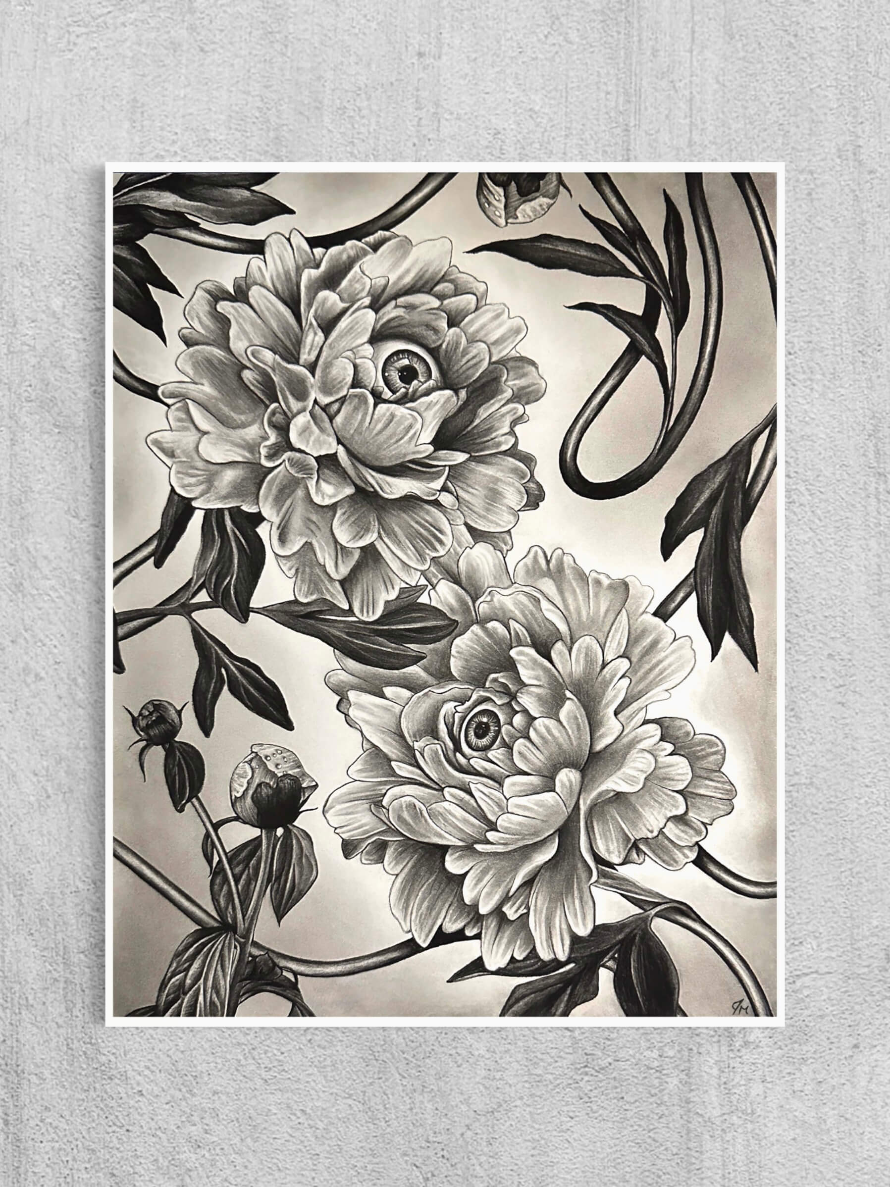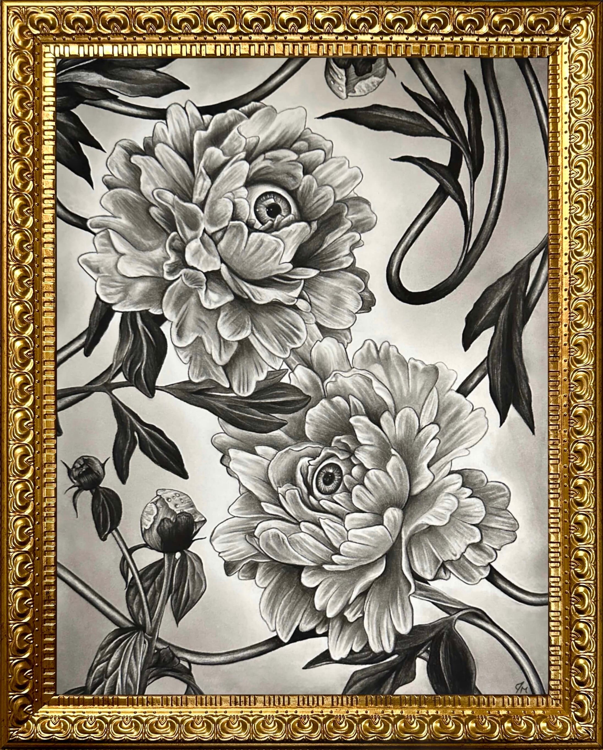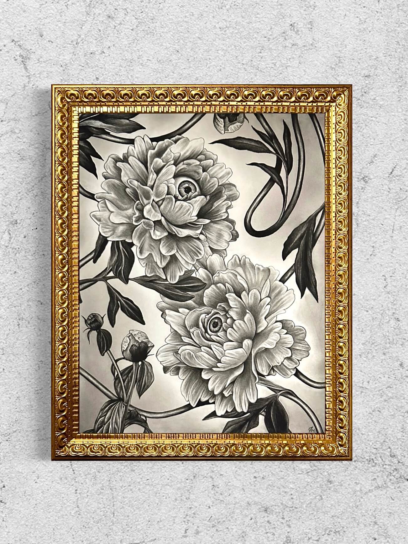 11x14 inch charcoal drawing on 270gsm smooth Bristol fine art paper. Includes fixative coating to preserve the drawing and prevent smudging. Comes protected behind glass, in a distressed metallic gold leaf frame, measuring 13x16 overall.