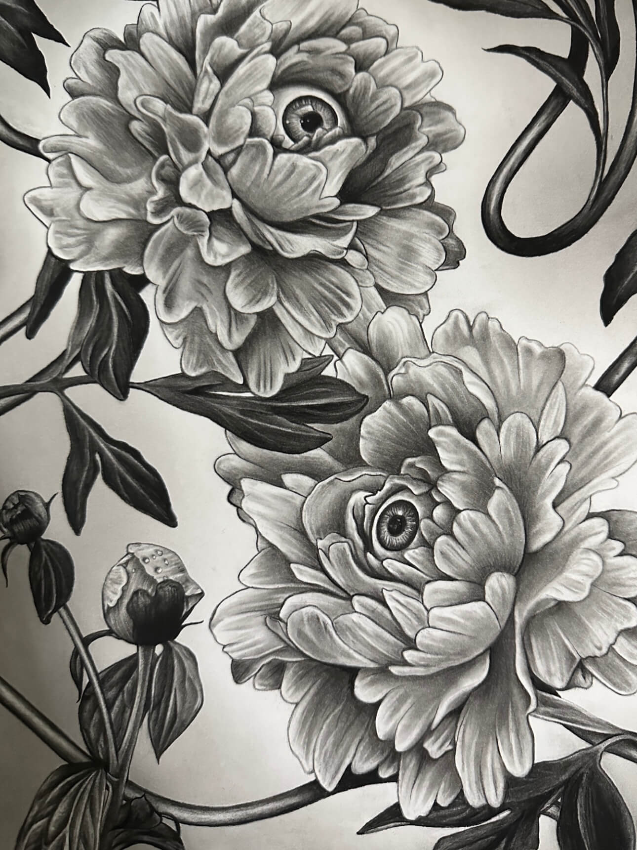 This piece is about the bittersweetness of growth. The flowers blossom, the vines reach out and intertwine, but the eyes in the heart of the flowers look elsewhere; all they can see is the growth of the other, for they cannot see their own beauty in the midst of change. They are in the space between where they are, and where they want to be; the space between the middle and the end.